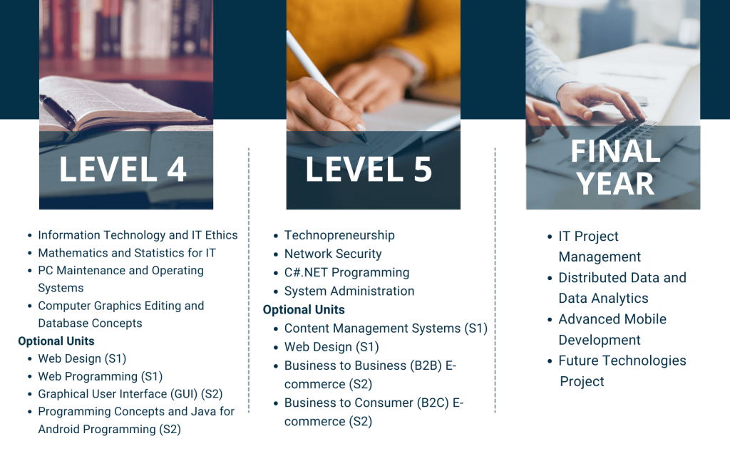 - be prepared for a career in an exciting industry with highly sought-after skills in computer programming, database development, networking, website development and information systems design